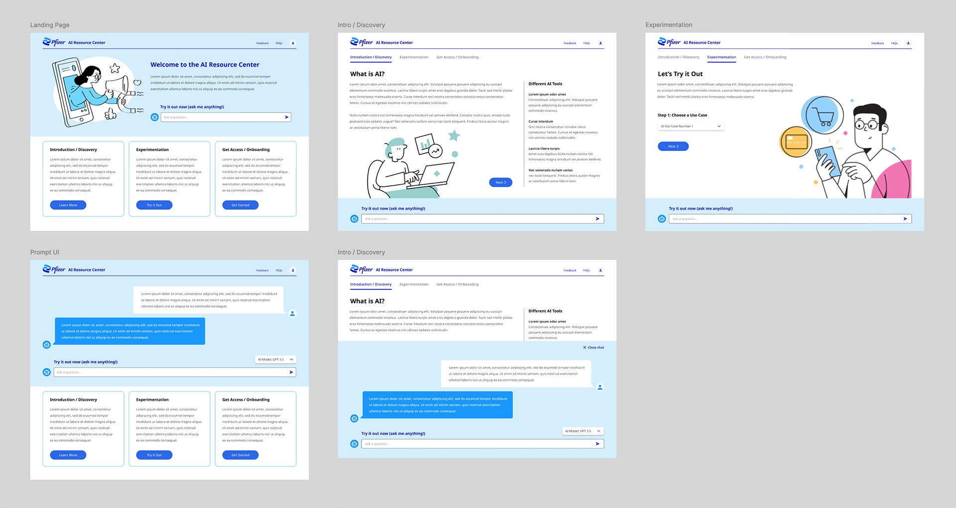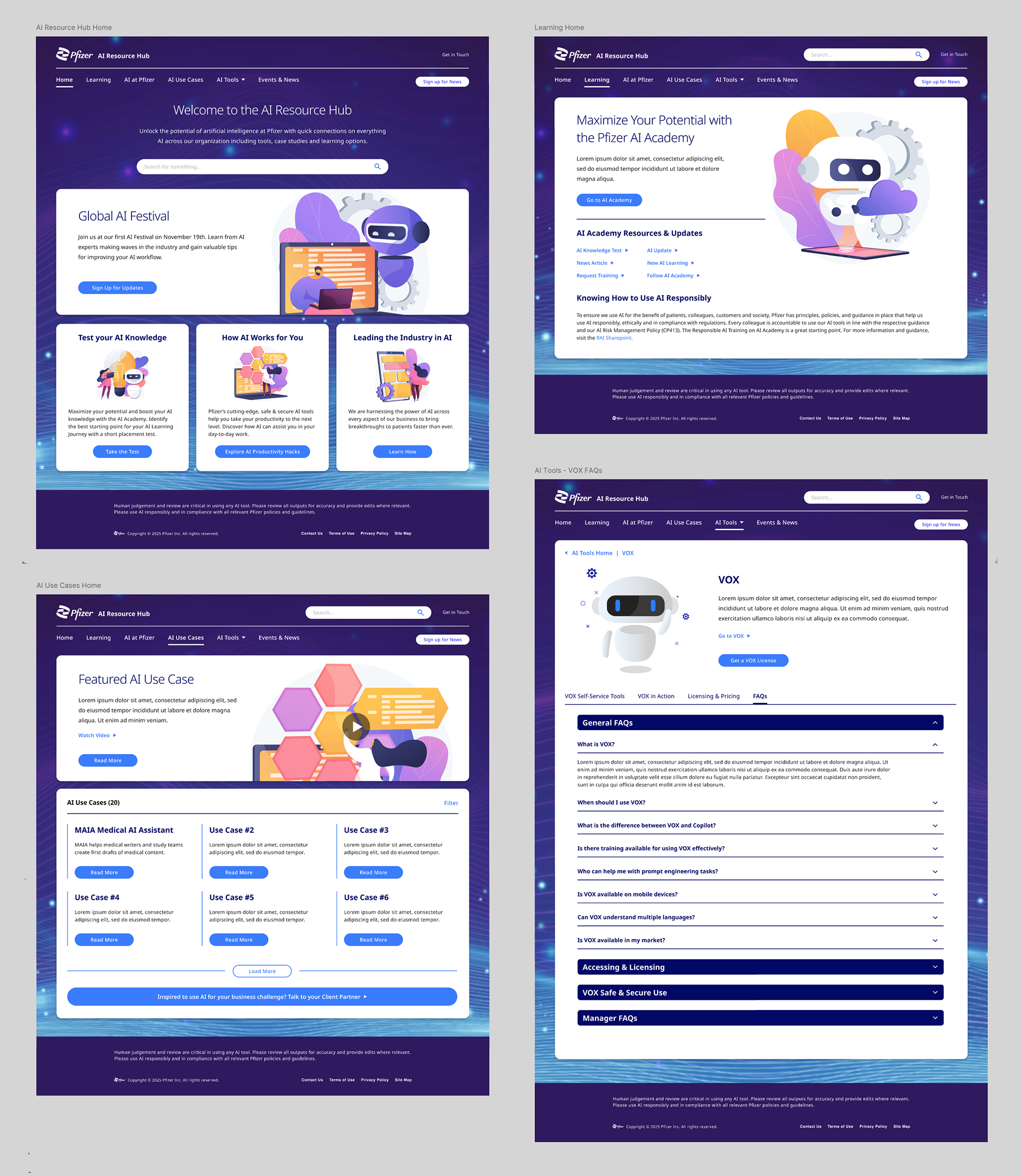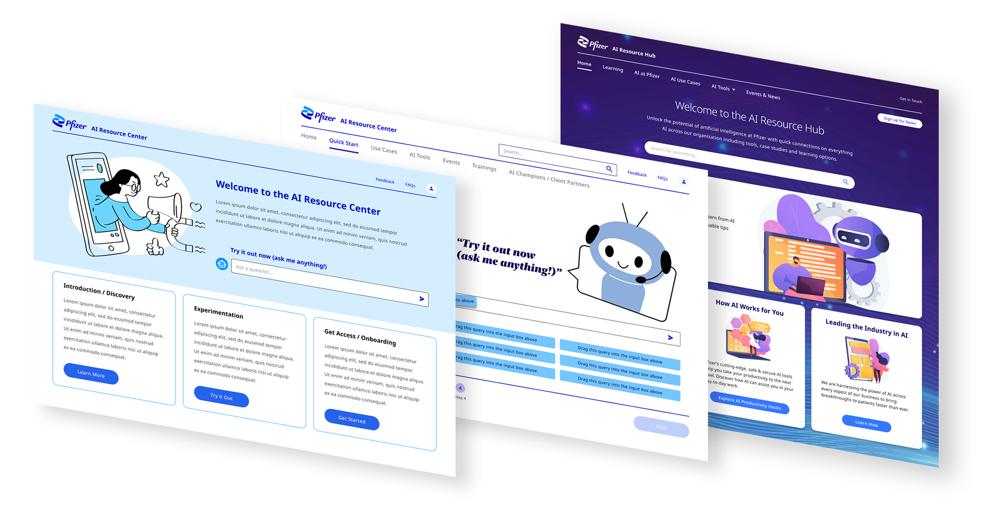 I was the principal UX and visual design lead for an internal site that helps educate colleagues across Pfizer about different AI products and resources that can be integrated into their daily workflows. The project went through three distinct design phases, each informed by requirements established through progressive user feedback.