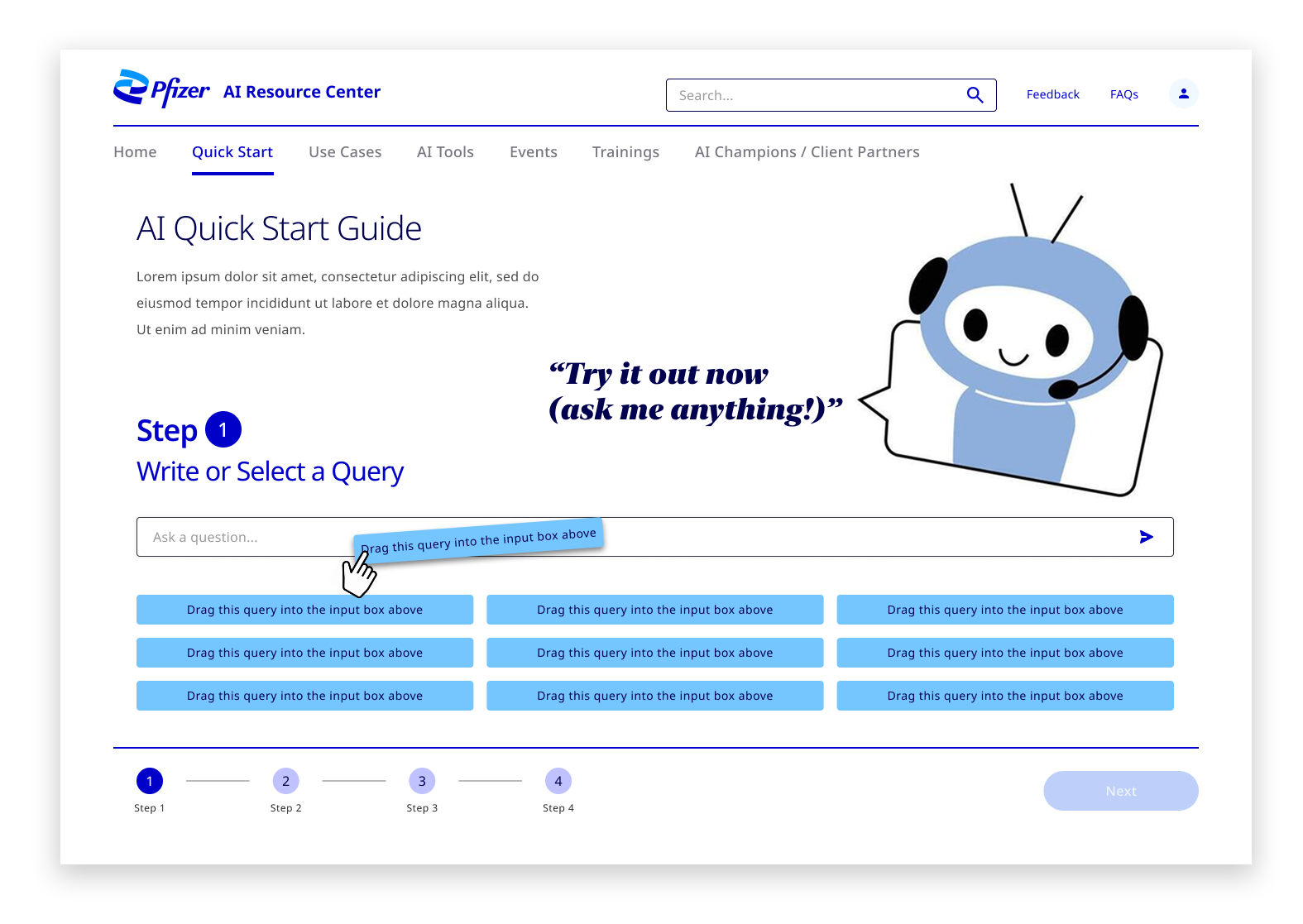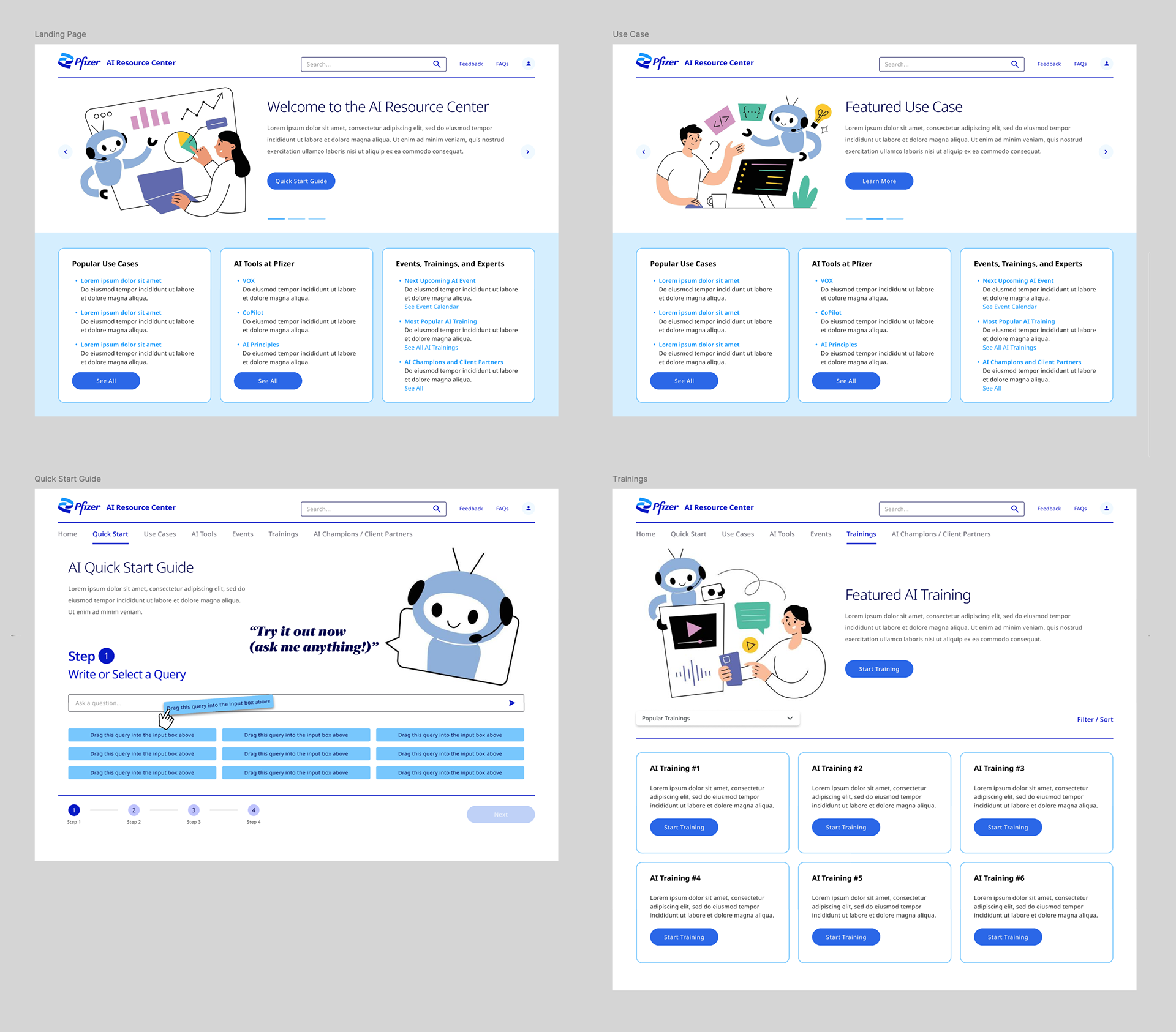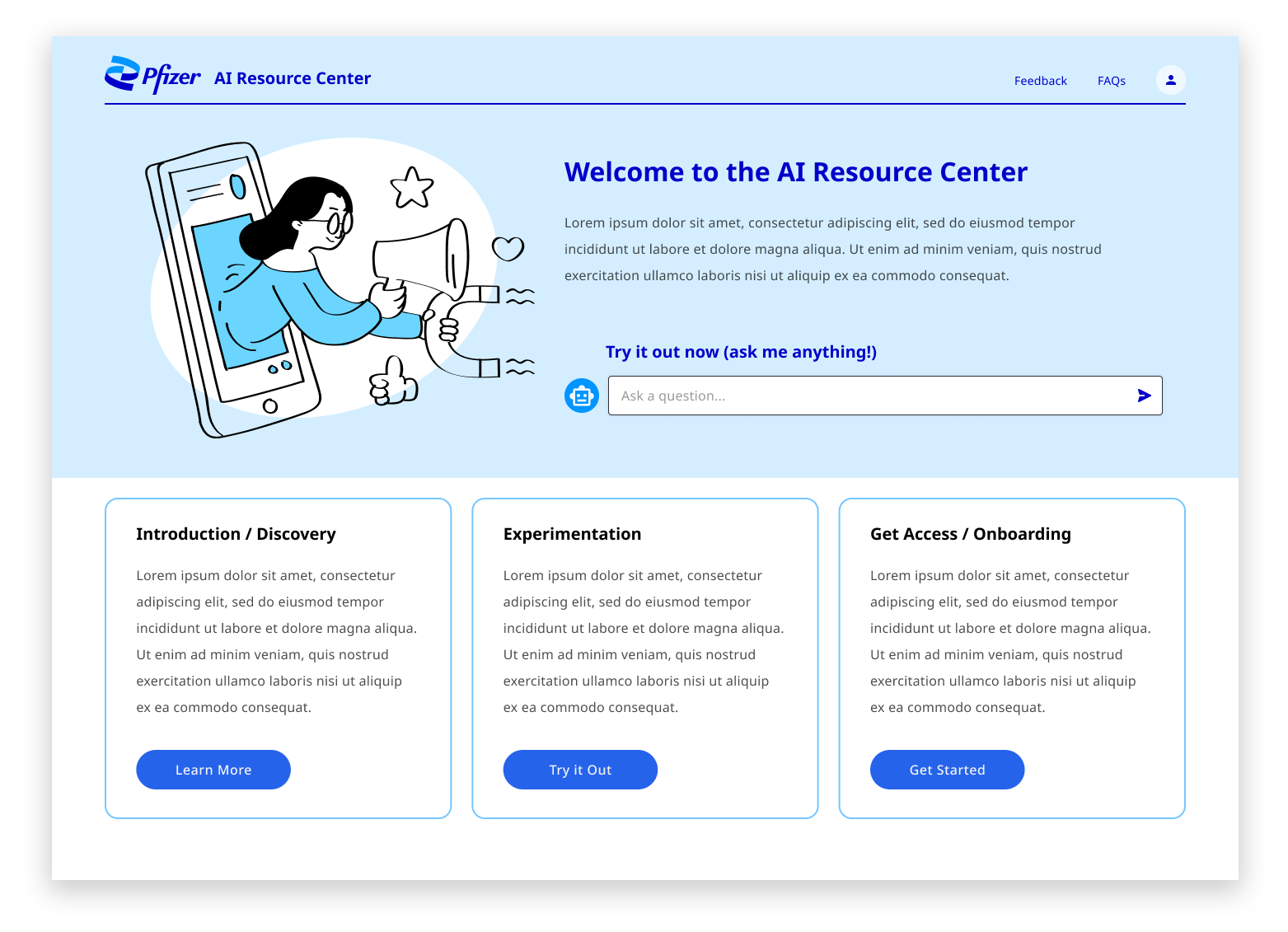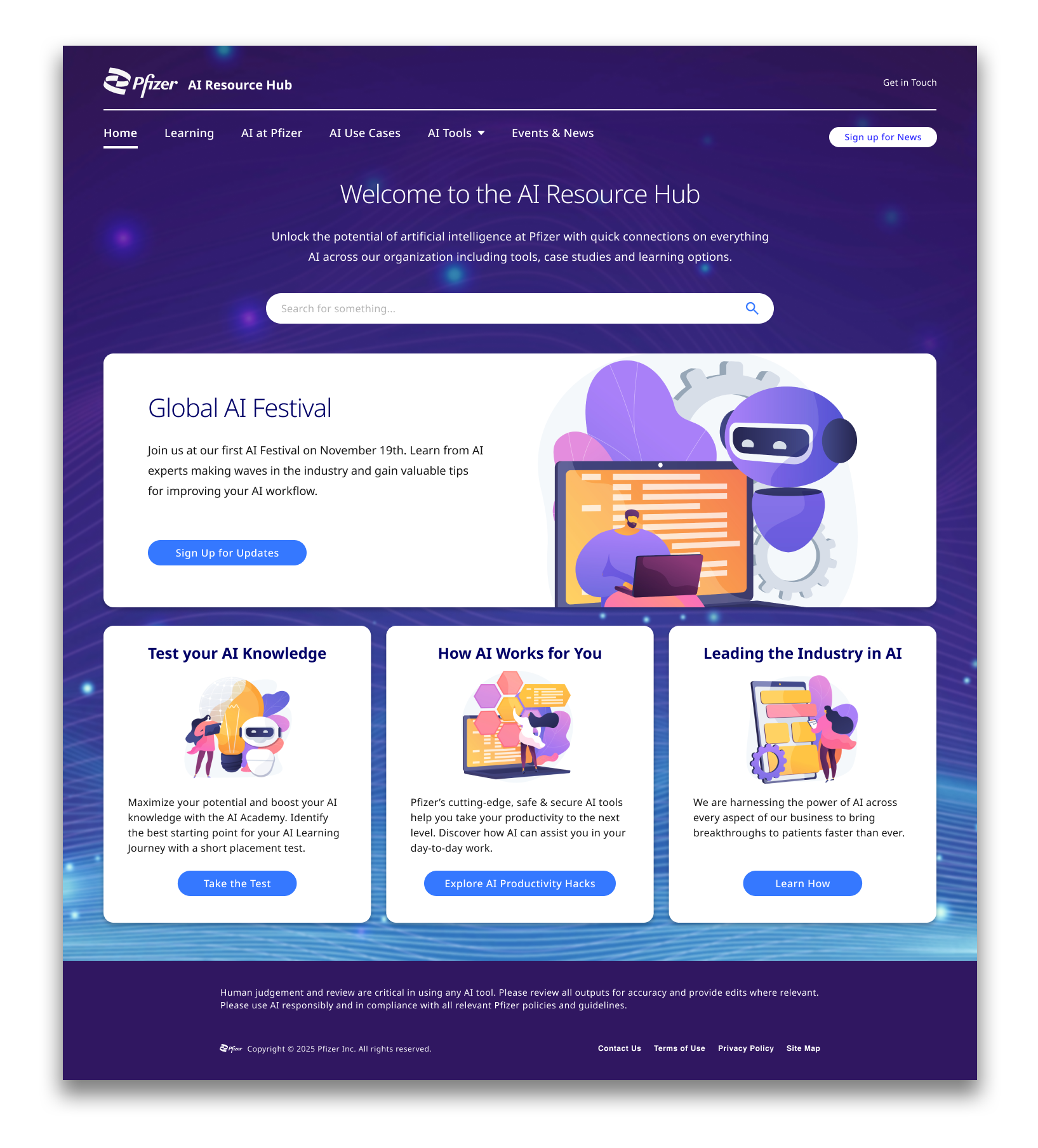 I was the principal UX and visual design lead for an internal site that helps educate colleagues across Pfizer about different AI products and resources that can be integrated into their daily workflows. The project went through three distinct design phases, each informed by requirements established through progressive user feedback.